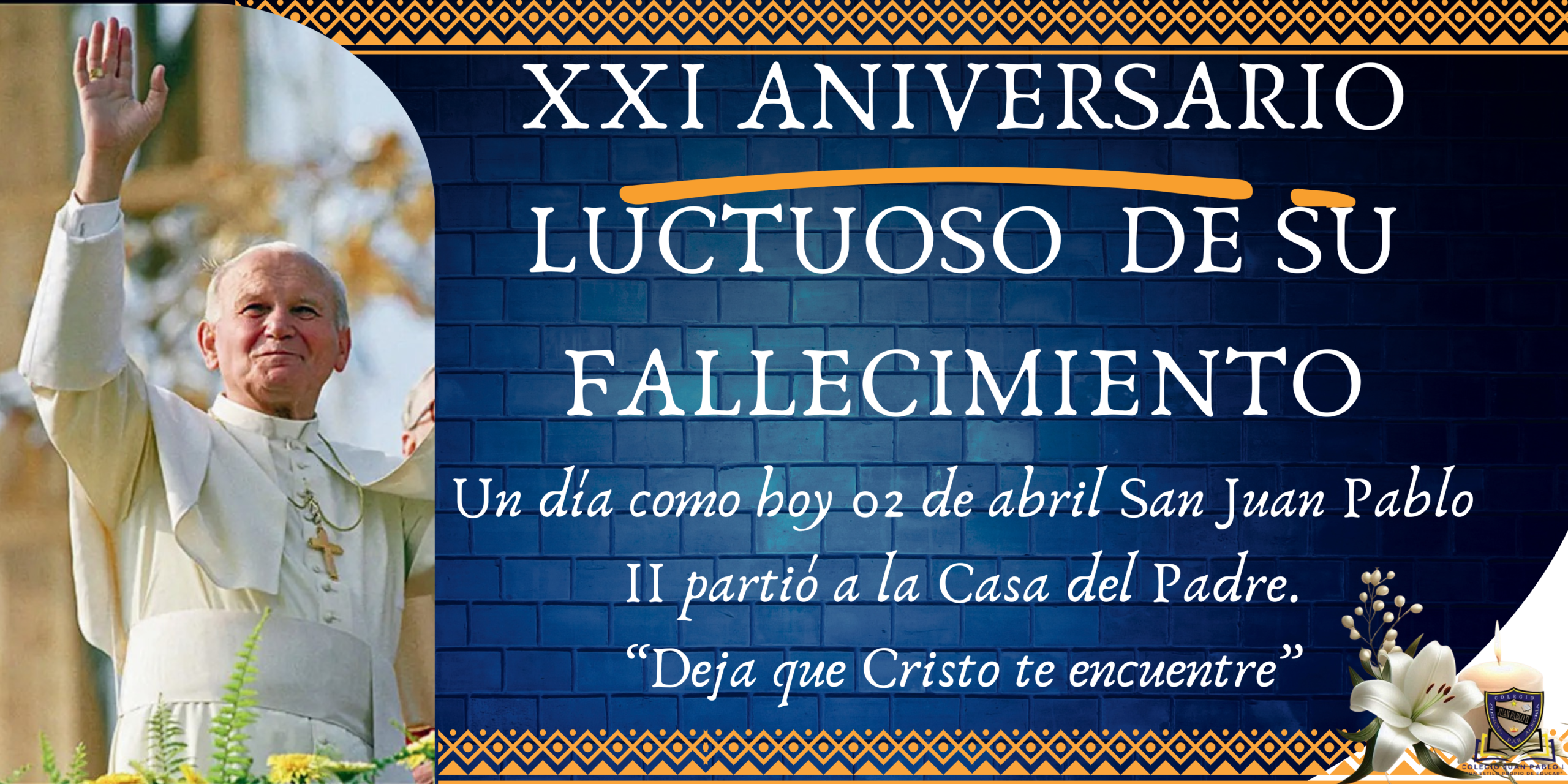 En conmemoración del fallecimiento de San Juan Pablo II, ocurrido el sábado 2 de abril del 2005. Recordamos su legado, vida y contribución a la Iglesia, así como fortalecer en nuestra comunidad los valores que él promovió a lo largo de su pontificado.